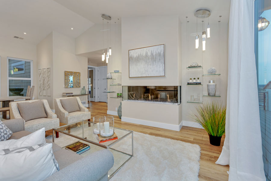 This elegant home, with its lofty elevation, large garden space, and open concept architecture called for a shimmering color palate. Soft pastel grays against pure whites, brushed nickel finishes, and exquisite contemporary light fixtures illuminate the space. Transitional furnishings and light wood grained continuous flooring balance sophistication with a comfortable welcoming feeling. Walls of glass open the home to the natural elements and enhance the extraordinary views.